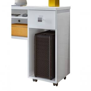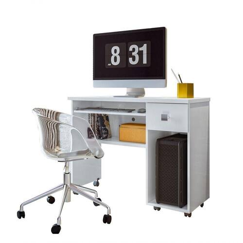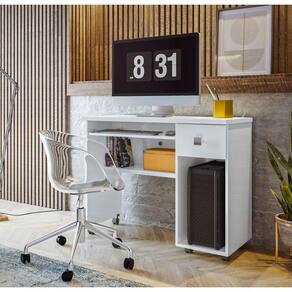 Escrivaninha Vicenza Branco - Lukaliam Móveis A Escrivaninha Vicenza - Lukaliam Móveis possui um design audacioso. Indicada para escritórios modernos, é uma mesa para computador compacta e funcional. Possui gaveta lateral que permite o armazenamento de documentos, prateleira inferior para que você coloque seu estabilizador, suporte para teclado acoplado com corrediças metálicas e ainda tem espaço para o cpu e caixinhas de som. Tudo que o seu escritório precisa, aproveite e leve!Dimensões do Produto Montado:Altura: 80 cmLargura: 98 cmProfundidade: 45 cmObservações:- Fabricado em MDP e MDF;- Puxador termoplástico;- Rodízios;- Suporte para teclado acomplado com corrediças metálicas;- Tampos em MDP de 25mm;- Pintura ultravioleta com acabamento brilho. Marca: Não Informado Ean: 7898571755770