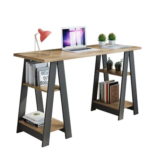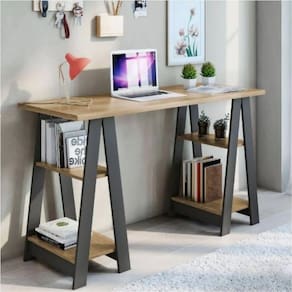 A decoração de escritório criativa é fundamental para deixar a rotina mais agradável e o trabalho mais produtivo. Além disso a praticidade é muito importante. Por isso destacamos a Mesa Vigor que proporciona um ambiente mais rústico com seu design em cavalete e cores que seguem um padrão de alta decoração, agregando mais beleza para o seu ambiente. Ela ainda conta com prateleiras deixando o produto bem funcional.