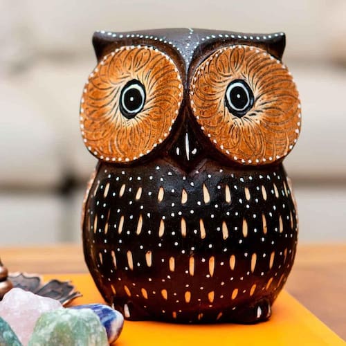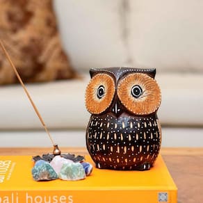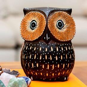 Escultura Coruja de Madeira Balsa Importada de Bali 16cm Escultura Coruja de Madeira Balsa Importada de Bali 16cm A coruja é a ave soberana da noite e para muitos povos elas simbolizam o mistério, a inteligência, a sabedoria e o conhecimento. Simboliza também a reflexão e o conhecimento intuitivo. Nossa coruja decorativa é perfeita para trazer charme ao ambiente. É feita de madeira balsa e pintada à mão com a técnica dots muito utilizada pelos balineses. Adquira a sua coruja e deixe a sua casa ou escritório mais bonito. Material: madeira balsa Cores Predominantes: Marrom Escuro Peso: aproximadamente 325g Largura: 9cm Altura: 16cm Profundidade: 9cm Origem: bali O produto é artesanal, fabricado e de Bali e por isso pode apresentar pequenas variações de cor, tonalidade, brilho, peso e tamanho. Não deixe a sua peça em contato prolongado com a água, a não ser que seja peça que possa ser exposta ao sol e chuva. As fotos são ilustrativas. Qualquer produto adicional utilizado na composição das fotos deve ser comprado separadamente. Marca: Não Informado