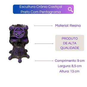 Escultura Crânio Castiçal Preto Com Pentagrama 13 cm Resina Escultura Crânio Castiçal Preto Com Pentagrama 13 cm Resina