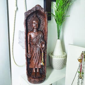 Escultura De Buda No Tronco Mudra Dar E Receber 05556 Manxs, o Mudra Abhaya em sânscrito significa destemor. Simboliza proteção, paz e dissipa o medo. Este mudra transmite proteção contra todos os medos que nos afligem na vida material. Com o braço dobrado, a palma da mão é elevada a nível do ombro, voltado para fora, com os dedos retos e apontando para cima. O mudra abhaya representa coragem e incentivo. Se você olhar para este gesto de mão de Buda, ou mudra, você também vai sentir a energia de proteção, paz e um sentimento de forte: a segurança interna profunda. Acredita-se que a mão de Buda assumiu esta mudra depois que ele atingiu a iluminação, transmitindo dot ter medo Há uma lenda interessante por trás desse mudra, como um elefante se aproximou de Buda foi dito para exibir o mudra Abhaya mão levantada , que imediatamente acalmou o animal. O primeiro Buda Sidarta Gautama ou Shakyamuni viveu por volta dos séculos 5 e 6 AC no Norte da Índia. Ele abandonou sua vida de riqueza para levar uma vida religiosa, em busca da iluminação. Viveu mendigando e meditando até que um dia atingiu um estado em que o medo do sofrimento ou da morte não o afetava mais. Passou a peregrinar e a ensinar aos seus seguidores, as Quatro Nobres Verdades, que descrevem o sofrimento da espécie humana, suas causas e a solução o Caminho Óctuplo . Tamanho: 28cm x 8cm x 7cm Dê a você e a quem você ama pura proteção. Venha Cuidar-se Na Mana Om Você recebe o seu Buda No Tronco Mudra Proteção E Boas Energias Gratidão, Namastê, Tudo de Ohm
