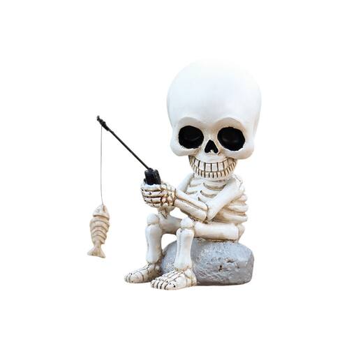 Material: Resina Tamanho: 13* 12,5* 8 cm Peso: 175 g ['Creepy Fishing Skeleton Design — Apresenta uma figura esquelética humorística sentada com uma vara de pescar, combinando charme assustador com detalhes divertidos para decoração de jardins de Halloween. ', 'Bobble Head Feature — A cabeça do crânio se move suavemente, adicionando movimentos realistas e animações assustadoras a exibições externas em bordas de pátios, lagoas ou degraus. ', 'Figura de resina durável — Feita de resina sólida, esta escultura é resistente às intempéries e adequada para colocação de longo prazo em jardins, pátios ou varandas. ', 'Enfeites compactos de Halloween — Medindo 13 × 12,5 × 8 cm, cabe facilmente entre lápides, abóboras, canteiros de flores ou cenas assustadoras de mesa. ', 'Estátua assustadora versátil — ideal para jardins mal-assombrados, decoração sazonal, exibições em lagos ou detalhes em prateleiras internas com tema gótico ou de terror.']