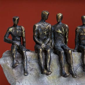 Cód: SS0338 Escultura Decorativa Homens Sentados na Pedra em Resina Bronze Material: Resina Cor: Bronze Dimensões: 38,5x24,5x12cm (CxAxL)