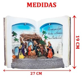 Material: Resina; Altura: 19cm; Comprimento: 27cm; 3 Pilhas 1,5v'' AA'' ( não incluído na embalagem ) Possui Luzes de LEDs; Modelo: Escultura Decorativa Bíblia Iluminada;