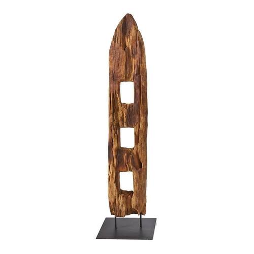 Escultura de madeira, objeto de ornamentação, com base metálica e corpo de madeira pau-ferro do sul, com cor natural, referência 200561.