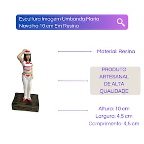 Escultura Imagem Umbanda Maria Navalha 10 cm Em Resina A Escultura Maria Navalha da Meta, é confeccionada em resina, então tem uma ótima resistência. Possui uma pintura bem detalhada feita à mão e é perfeita para compor o seu ambiente ou o seu altar. Nossa escultura é carregada de fé e paz, trará ótimas energias para sua vida e dará muita luz no seu caminho!