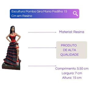 Escultura Pomba Gira Maria Padilha 15 Cm em Resina Entidade representada por uma mulher sensual, independente e dominadora.Esta escultura em resina trará boas energias, bons fluídos e harmonia para sua casa. É ideal para colocar em seu altar ou completar a decoração de seu ambiente. Esculturas são itens especiais e decorativos, é um recurso que dá um toque a mais em qualquer ambiente, tem um valor espiritual e sentimental. Você pode enfeitar com um estilo próprio com muito bom gosto o seu altar ou ambiente.Aplicação:Decora sala, estantes, home office, altares, aparadores, mesa de canto ou escritório. É também uma ótima opção para presentear, tem um excelente acabamento e pintura feita a mão, permite mais beleza e estilo para sua casa ou escritório.Dimensões da peça aproximadas: C x L x A 5,50 cm x 7 cm x 15 cmPeso aproximado da peça: 271 gMaterial: 100% Resina de alta qualidade - lavávelTire todas as suas Dúvidas antes de concluir a compra. Iremos responder o mais breve possível.Embalagem de Envio:Caixa de papelão ondulado, plástico bolha, conforme necessidade do produto.Consulte nossos preços e condições para vendas.Ideal para o seu altar. Ótima resistência e durabilidade.Respostas das dúvidas mais frequentes na ordem:R1: Já realizamos milhares de entregas em todo o Brasil, somos especialistas no que fazemos.R2: Assim que seu pedido for despachado, esta plataforma envia para você o código de rastreamento.R3: Enviamos o produto 100% inspecionado e conferido em nosso checkout e são embalados em embalagem de papelão e plástico bolha.R5: Iremos despachar o seu produto o mais rápido possível, assim que for confirmado pela plataforma, enviamos em até 24h.R6: Nós queremos a sua satisfação, qualquer problema iremos te auxiliar em nossos canais de comunicações. Marca: Lua Mística - 100% Original - Loja Oficial