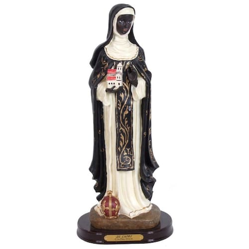 Ao chegar o momento de sua morte, Santa Efigênia teve um aviso de Deus e isto, para ela, foi motivo de grande alegria. Então, ela doou tudo o que ainda tinha de seu. Logo, uma doença tomou seu corpo. Ela recebeu os sacramentos e esperou sua morte em paz. Esta chegou e a levou para o céu, junto a Jesus Cristo que ela amava e a São Mateus, que a tinha evangelizado. No momento de sua morte, um perfume maravilhoso e suave espalhou-se pelo Convento e pairou sobre todos um clima de paz e de louvor a Deus. Santa Efigênia é invocada como protetora contra incêndios, como padroeira dos militares e como auxiliadora de quem precisa da casa própria. Ficha técnica Comprimento: 14 cm Largura: 10 cm Altura: 30 cm Cor principal: Colorido Material: Resina com base de madeira Marca: Meerchi