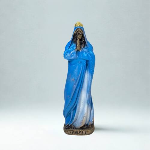 Representação delicada de Santa Sara Kali, padroeira dos povos ciganos, com acabamento vintage que traz um charme especial à peça. Produzida em resina com riqueza de detalhes, é ideal para pequenos altares, decoração espiritual ou como presente de proteção e fé. Seu tamanho compacto permite colocá-la em diversos ambientes com elegância e discrição.