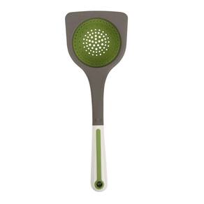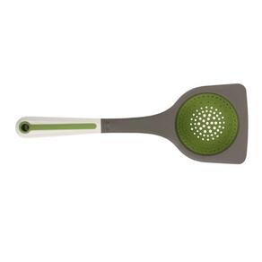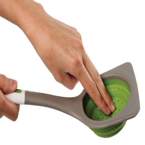 A escumadeira da linha Fresh Force da Chef'n escorre alimentos fritos, pode ser usada para tirar o macarrão da água e quando desdobrada tem a função de peneira.