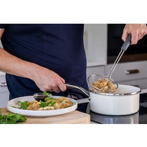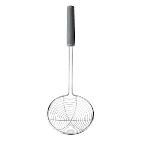 A escumadeira da KitchenAid possui a parte principal feita de aço inoxidável extra grande com aberturas, permitindo que o líquido escorra rapidamente.