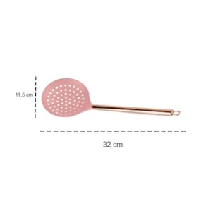 Escumadeira rosa de naylon e cabo em alumínio dourado gold. Utensílios de cozinha Plasvale são resistentes até 210°C e pensando na preservação da sua saúde, eles são BPA Free, ou seja, não libera Bisfenol A que é o composto tóxico que faz mal à saúde ao entrar em contato com algum tipo de alimento.