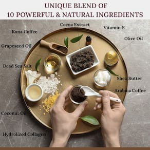 Nossa mistura potente de café árabe e Kona, sal do Mar Morto e extrato de cacau ajuda a apagar impurezas e células mortas da pele, revelando uma nova camada de pele fresca e saudável. A cafeína e o colágeno em nosso esfoliante podem ajudar a reduzir a aparência da celulite e melhorar a elasticidade da pele, para que você possa exibir seus recursos com confiança.