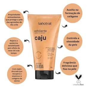 O Esfoliante Rosto e Corpo Caju tem propriedades antioxidantes, que protegem a pele das agressões do dia a dia e repara a epiderme sensibilizada pelo efeito de raios UV e do tempo. Com argila dourada que recupera a elastina e o colágeno da derme. Uso facial e corporal. Auxilia na formação de colágeno. Controle da oleosidade.