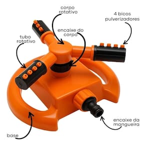 Quantidade de Tubos Irrigadores: 3 Tubos girátórios 360 graus Quantidade de Bicos por Tubo Irrigador: 4 Bicos por Tubo Comprimento: 20,5 cm Altura: 8 cm Cor do Irrigador: Laranja e preto Modelo: Aspersor Rotativo Alcance Mín. Aprox. (m): 1Alcance Máx. Aprox. (m): 10 Conteúdo da Embalagem:1 Base1 Aspersor 3 Tubos Material: Plástico