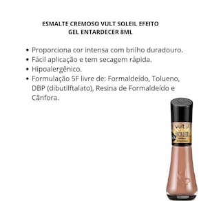 A Vult 5 Free Soleil é uma linha de esmaltes vegana, cruelty free e 5 free: livre de Formaldeído, Tolueno, DBP dibutilftalato , Resina de Formaldeído e Cânfora, ingredientes que podem causar alergias e irritações.