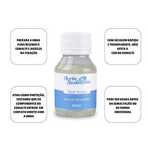Contém: 01 - Esmalte Tratamento Base Incolor, 60ml, Arte Sedução A Base Incolor da Arte Sedução é um esmalte de tratamento indicado para proteger as unhas. Ela prepara a unha para receber o esmalte e auxilia na fixação, servindo como proteção ao evitar que os componentes do esmalte entrem em contato direto com as unhas. Com aspecto transparente e secagem rápida, garante uma esmaltação perfeita. Na embalagem de 60ml, rende muito mais, sendo ideal para uso em salões de manicure ou mesmo para quem costuma fazer as unhas em casa com frequência. Características Principais: - 60ml; - Protege as unhas evitando contato direto com os pigmentos do esmalte; - Secagem rápida; - Mais brilho; - Acabamento uniforme das unhas; - Pode ser Utilizado antes da esmaltação ou de forma individual; - Excelente Custo-Benefício.