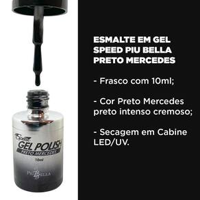 -frasco com 10ml; -cor preto Mercedes -preto intenso cremoso; -secagem em Cabine LED/UV. Modo de uso Aplique sobre as unhas já com os preparadores específicos. E secar em cabine por 30 segundos, poderá finalizar com top coat.