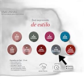- esmalte com mega pincel - secagem rápida - acabamento perfeito de salão - alta cobertura - máxima cor e brilho - acabamento em gel - hipoalergênico - fórmula 3 free: livre de dibutilftalato dbp , formaldeído e tolueno.