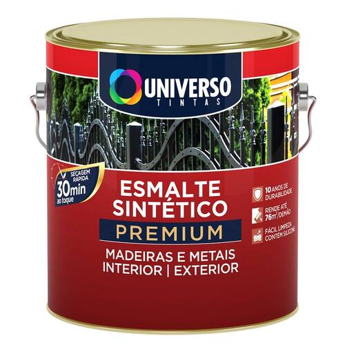 Descrição: Universo Esmalte Sintético Premiun é um produto especialmente desenvolvido para uso interno e externo em superfícies de metais ferrosos, alumínio, galvanizados e madeiras. Fácil de aplicar, possui secagem rápida e alto rendimento. Disponível no acabamento acetinado.