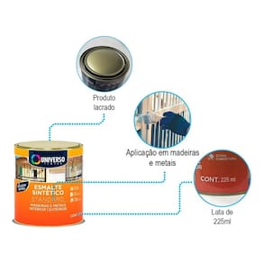 Descrição: Universo Esmalte Sintético Standard é um produto especialmente desenvolvido para uso interno e externo em superfícies de metais ferrosos, alumínio, galvanizados emadeiras. Fácil de aplicar, possui secagem rápida e alto rendimento. Contém silicone que cria proteção prolongada, facilitando a limpeza e conservação do brilho.