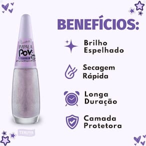 Com as unhas limpas, aplique uma gota do Esmalte Top Coat Impala Pov Tô Pronta na unha, espalhe o esmalte até a base e puxe até a ponta, fazendo uma linha reta. Repita a operação em todas as unhas. Se desejar, aplique uma segunda camada para intensificar o brilho e a proteção. Para melhores resultados, recomenda-se remover a cutícula e aplicar uma base para cobrir as imperfeições antes do esmalte colorido e, em seguida, o top coat.
