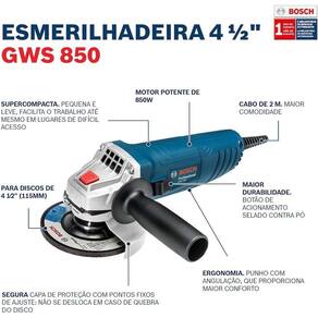 Possui 850 Watts de potência, e é uma solução para realização de cortes e desbastes em materiais metálicos, como ferro e aço, e também pode ser utilizada para corte em alvenaria e concreto. (Note que para cada tipo de aplicação existe um acessório correto - discos abrasivos ou discos diamantados). Esta máquina conta com capa de proteção de 4.1/2" / 115 milímetros com sistema de fixação por meio de parafuso, que garante que a capa não se desloque em caso de rompimento do disco dando mais segurança ao operador da ferramenta. Conta também com Empunhadura auxiliar. Suas características geram praticidade e trabalhos menos cansativos ao usuário. Além disso o seu interruptor de acionamento é selado contra a entrada de pó para garantir maior vida útil, ela é compacta e leve - pesa apenas 1,7 kg, facilitando assim aplicações em locais de menor tamanho e de difícil acesso.