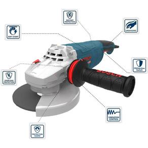 Impede o reinício da ferramenta no caso de queda de energia, enquanto o interruptor ainda estiver na posição ligado. A ferramenta inicia suavemente e não dá um arranque repentino, trazendo mais segurança para o usuário. A ferramenta desliga automaticamente em situações de sobrecarga extrema, para avisar o usuário sobre o uso correto e para proteger o motor da queima. Microprocessador que desliga a máquina assim que detecta travamento do acessório Controle de vibração na empunhadura principal e no corpo da máquina. Menos fadiga e maior segurança para o usuário gatilho homem morto interruptor que requer pressão contínua para funcionamento do motor, minimiza o risco de acidentes Resistente à quebra do disco, proporcionando maior segurança para o usuário Empunhadura soft grip, melhor manuseio e maior segurança durante o trabalho