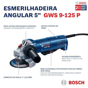 A esmerilhadeira angular Bosch GWS 9-125 P, possui 900 Watts de potência, 127 V e é a solução ideal para realização de cortes e desbastes em materiais metálicos, como ferro e aço, e também pode ser utilizada para corte em alvenaria e concreto. A esmerilhadeira angular Bosch GWS 9-125 P conta com capa de proteção de 125mm, com sistema de fixação por meio de parafuso, que garante que a capa não se desloque em caso de rompimento do disco, dando mais segurança ao operador da ferramenta. Conta também com empunhadura auxiliar traz mais conforto durante o uso. Seu formato ergonômico e o peso reduzido de 1,7 kg permite trabalhos mais longos e facilita aplicações em locais menores e de difícil acesso.