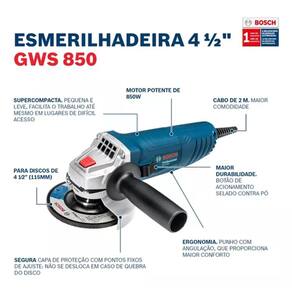 Esmerilhadeira Angular 4.1/2" 850W GWS 850 220V BoschPara quem precisa de uma ferramenta eficiente e segura para realizar serviços de corte e abastes em metais, avelnarias e concreto, a Esmerilhadeira Angular 4.1/2" 850W GWS 850 220V Bosch é a solução ideal!Com um design leve e compacto, ela possibilita maior comodidade em seu uso. A esmerilhadeira é indicada para trabalhos em pequenas áreas e uso frequente.Características da Esmerilhadeira Angular 4.1/2" 850W GWS 850 220V BoschEsta esmerilhadeira do modelo GWS 850 é da marca Bosch. Utiliza disco angular de 115 mm ou 4.1/2”. Possui eixo M14 com trava. Funciona por eletricidade, com 220V de tensão elétrica. Tem velocidade de 11000 RPM, 850W de potência e não possui controle de velocidade.A ferramenta acompanha uma incrível maleta que contém: 1 Punho Auxiliar; 1 Chave de Pinos; 1 Capa de Proteção; 1 Flange e 1 Porca de Aperto. A maleta mede 83 mm de altura, 243 mm de largura, 290 mm de profundidade e pesa 2,75 kg.Vantagens da Esmerilhadeira Angular 4.1/2" 850W GWS 850 220V BoschA Esmerilhadeira Angular 4.1/2" 850 W GWS 850 220V Bosch é uma ferramenta leve e compacta, que pode ser levada para qualquer lugar e com um corpo ergonômico que garante um manuseio confortável;A marca Bosch é garantia de um produto de qualidade, que proporciona o melhor acabamento para sua peça a um preço acessível. Além disso, ela possui excelente rendimento, o que diminui o tempo do seu serviço.Ela conta com uma potência adequada para aplicações profissionais de pequeno porte somado a uma durabilidade garantida pelo interruptor de acionamento selado contra a entrada de pó, o que aumenta a vida útil.Junto de todas essas vantagens, a Esmerilhadeira Angular 4.1/2" 850W GWS 850 220V Bosch é sinônimo de segurança graças a capa de proteção de 4.1/2" (115mm) com sistema de fixação por meio de parafuso, que faz com que a capa não se desloque em caso de rompimento do disco.Informações ExtrasA esmerilhadeira Bosch possui 1 ano de garantia pelo fabricante!Atenção: para um manuseio seguro da ferramenta, é indicado o uso de equipamento de proteção individual.
