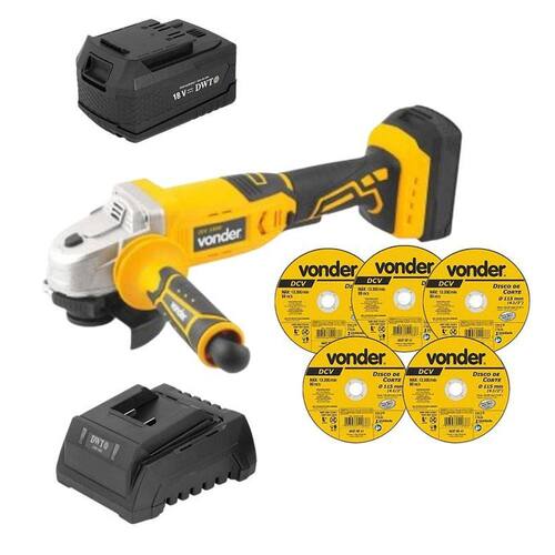 Conteúdo da Embalagem: 1 Esmerilhadeira 4.1/2 IEV 1808 Vonder + 1 Carregador de bateria DWT + 1 Bateria 18V 4Ah DWT + 5 Discos de corte 115,0 mm x 1,0 mm x 22,23 mm, DCV, VONDER - Esmerilhadeira 4.1/2 IEV 1808 Vonder legal: 90 dias + contratual: 9 meses Para locadoras, única e exclusiva de 90 dias 1 Esmerilhadeira, acompanha: 1 punho auxiliar, 1 chave e 1 capa de proteção do disco. Este equipamento utiliza um modelo de bateria que pode ser intercambiável não acompanha , ou seja, uma bateria que é compatível com outros modelos de ferramentas a bateria VONDER. Por isso, em sua próxima compra de ferramenta a bateria VONDER, procure um modelo que comece com a referência I, ou que esteja identificado com o selo Bateria Intercambiável VONDER. Desta forma, você garante modelos mais econômicos, sem a necessidade de aquisição de novas baterias e carregadores para uso em seu equipamento. Possui punho auxiliar com duas posições de fixação que atua como apoio durante o manuseio da ferramenta, adaptando-se a diferentes situações e locais de uso, muitas vezes de difícil acesso. Com estrutura compacta, conta com botão de trava do eixo e dupla isolação, garantindo maior segurança ao operador. Indicada para corte, desbaste e acabamento em superfícies metálicas. DETALHES TÉCNICOS Modelo: IEV 1808 Bateria: Capacidade da esmerilhadeira disco : 4.1/2 - 115 mm Rosca do eixo: M 14 Tipo de velocidade: Fixa Rotações por minuto rpm : 8.500/min Número de posições de ajuste do punho: 2 posições Ajuste do cabo da esmerilhadeira: Fixo Tensão do carregador de bateria: Não acompanha Aceleração transmitida nas mãos - braços do operador - ah: 9,06 m/s Incerteza da aceleração transmitida nas mãos - braços do operador - k: 1,5 m/s Massa aproximada peso : 1,74 kg Acessórios/peças que acompanham o produto: Acompanha: 1 punho auxiliar, 1 chave e 1 capa de proteção do disco - Bateria 18,0 V, íons de lítio, linha intercambiável, 4,0 Ah, IBD 1804 DWT Conteúdo da Embalagem: legal: 90 dias + contratual: 9 meses 1 Bateria. Indicada para a linha de ferramentas a bateria intercambiável VONDER / DWT. Carregadores indicados: carregador de bateria 18 V ICBV 1805 60.04.180.500 , carregador de bateria carga rápida 18 V ICBV 1806 60.04.180.600 ou carregador de bateria para automóveis 12 V 60.04.184.300 . Modelo: ibd 1804 Tipo de bateria: Íons de lítio Tensão V : 18,0 V Capacidade da bateria A : 4,0 Ah Indicador de bateria fraca: Sim Massa aproximada peso : 0,5 kg Fluxo de aplicação de cola: 15 g/min Tempo de aquecimento: 3 minutos Tensão do carregador de bateria: - Disco de corte 115,0 mm x 1,0 mm x 22,23 mm, DCV, VONDER Conteúdo da Embalagem: 1 Disco de corte. Proporciona cortes rápidos e menor geração de calor e rebarbas.Indicado para cortar aços e suas ligas, inclusive aço inox. Ideal para operações de corte que necessitam excelente acabamento corte fino . Não utilizar em serra mármore. legal: 90 dias Modelo: dcv Diâmetro do disco de corte: 115 mm Espessura: 1,0 mm +/-3/64 Tipo de disco: Tipo 41 Diâmetro do furo: 22,23 mm 7/8 Grão: g 60 Número de telas do disco: 2 Rotação máxima do disco rpm : 13.300/min Segue norma s : ABNT NBR 15230 e ABNT NBR 16245