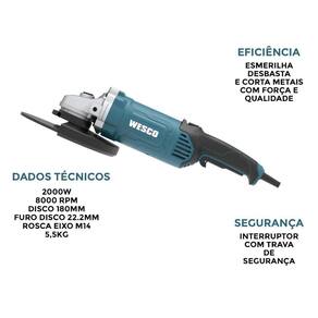 Esmerilhadeira angular com 180 mm e 2.000 w da wesco, modelo ws4721 + 3 discos vonder, luvas e óculos Este é o lançamento da wesco, a superesmerilhadeira ws4721 com 2000w e pronta para o trabalho de alta performance. Ela é robusta e possui uma carcaça resistente, que possibilita a sua ação em locais que exigem força e qualidade. Diferenciais da ws4721 Possui caixa de engrenagens em alumínio; Conta com empunhadura principal giratória para melhor posicionamento de uso; Possui capa de proteção com ajuste sem chaves; Vem com empunhadura auxiliar com 3 posições; Conta com o sistema de trava de eixo para a troca do disco; Para a sua segurança, a ws4721 é equipada com com trava de segurança e liga/desliga lateral. Dados técnicos: Tensão nominal: 50/60hz; Potência nominal: 2000 w; Velocidade nominal: 8000 /min; Tamanho do risco: 180mm; Furo dos discos: 22.2mm; Rosca do eixo: m14; Duplo isolamento: sim; Peso: 5.5kg. Itens que acompanham a máquina: -01 capa de proteção com ajuste rápido; -01 empunhadura auxiliar; -01 chave para troca do disco; -01 chave allen; -03 discos vonder; -01 par de luvas; -01 óculos de segurança. Marca: Não Informado Ean: 7909463124267