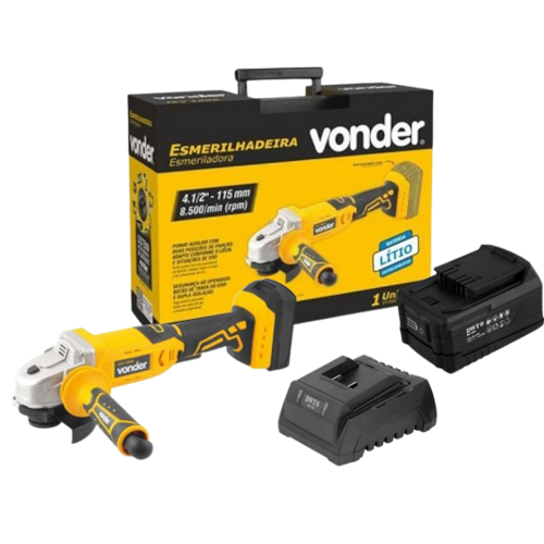 Conteúdo da Embalagem: Esmerilhadeira Vonder 4.1/2 IEV 1808 + Bateria 18V lítio 4 Ah IBD 1804 DWT linha intercambiável + 1 carregador de Bateria DWT