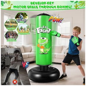 Saco de pancadas inflável infantil Esnowlee com aproximadamente 120 cm de altura, indicado para crianças a partir de 36 meses em atividades de boxe recreativo em ambientes internos ou externos planos. Produzido em PVC de espessura reforçada, conta com base alargada para enchimento com água ou areia, garantindo maior estabilidade durante socos e chutes.