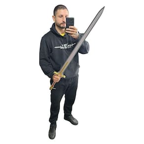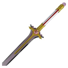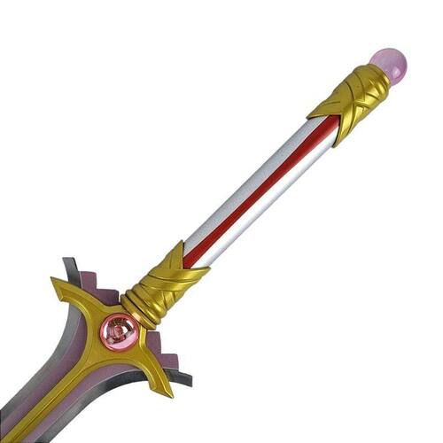 Espadada toda em metal com pintura automotiva e detalhes em toda a sua extensão, pomo e guarda com uma joia rosa.