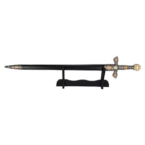 Templários Prata E BronzeCaracterísticas principais:Completamente decorativoProduto TemáticoRico em detalhadoAcompanha suporte de mesaÓtima peça para decoração ou coleçãoMedidas:Comprimento Total : 74 cmLâmina : 56 cmCabo : 14 cmSuporte : 26 x 7 x 16 cmEspessura da lâmina : 3 mmPeso : 640gPeso com Bainha: 855gIncluso:1 Espada1 SuporteEste produto não é afiado, apenas para fins decorativos/Cosplay. Marca: Tenda Medieval