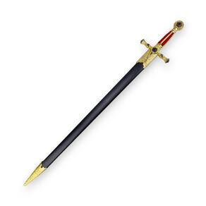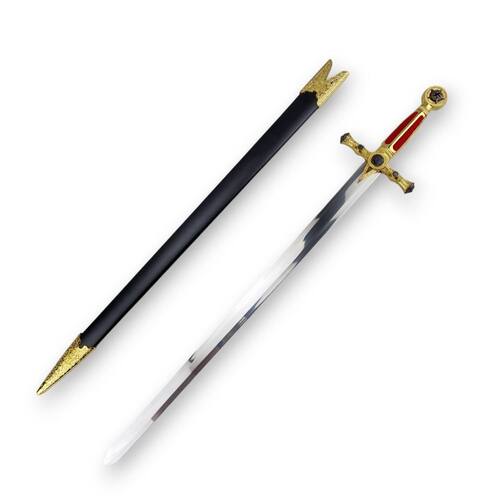 Comprimento Total : 84cm Comprimento espada: 75 cm Lâmina : 55 cm espessura : 3 mm Cabo : 14 cm Cor: Vermelho e Dourado Material: Aço