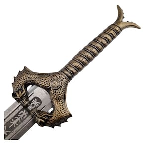 O cabo, com seu acabamento em metal dourado, destaca-se pela simbologia: a guarda em forma de cabeça de dragão e o pomo com o rabo do dragão são complementos perfeitos para essa espada lendária. A combinação dos detalhes dourados com a lâmina cria uma peça única e imponente.