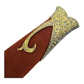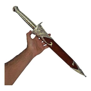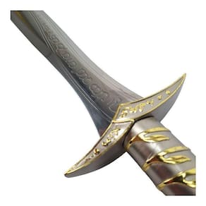 Espada ferroada senhor dos anéis hobbit frodo ãlfica Espada élfica senhor dos anéis hobbit Linda espada com detalhe dourados, sua lamina contem escrituras élficas dando uma elegância para a espada, sua bainha e revestida de couro e detalhes metálicos. Atenção esta espada não contém fio de corte, ideal para colecionar ou decorar Medidas: Comprimento da 59 cm Comprimento da lâmina 42 cm Empunhadura 15 cm Bainha 47 cm Peso 686 g Peso com bainha 1097 Marca: Não Informado
