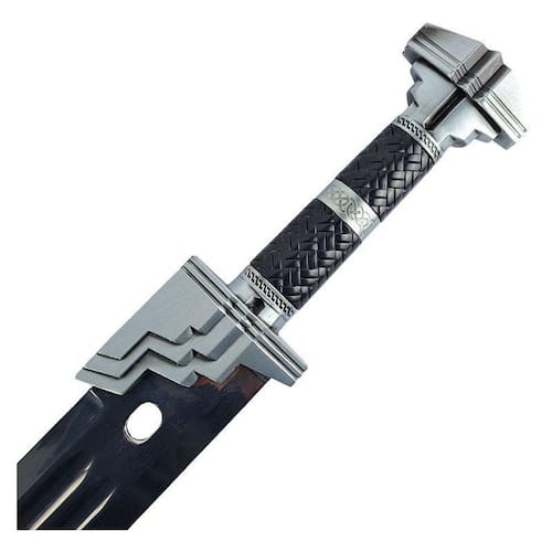 Detalhes Geométricos: O pomo e a guarda esculpidos em relevo adicionam uma riqueza de detalhes a esta espada, tornando-a uma peça de destaque.