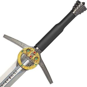 Gosta da série de TV Witcher A Netflix Witcher Steel Sword é uma peça maravilhosa para qualquer fã da série Witcher ter e desfrutar. Feita de aço inoxidável, esta espada apresenta um design inspirado na série de sucesso da Netflix. Possui lâmina de dois gumes. A lâmina tem um comprimento mais cheio. Runas gravadas adornam a lâmina. Em seguida, a espada continua com sua distinta guarda cruzada. Os braços da guarda cruzada prateada se inclinam em direção à lâmina. De um lado, há um disco dourado no centro da guarda. Metade do disco tem um recorte semicircular que fica no lado da lâmina da proteção cruzada. A outra metade apresenta detalhes em verde e vermelho. Acentos verdes adicionais adornam o anel ao redor do recorte.