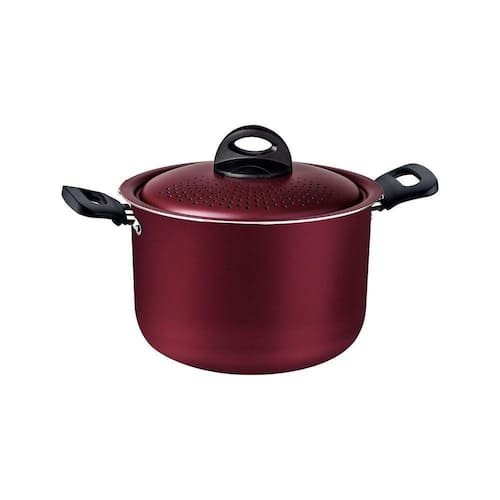 Com a espagueteira Tramontina Loreto em alumínio com revestimento interno e externo em antiaderente Starflon Max vermelho 22 centímetros de diâmetro 5, 7 litros você garante maior praticidade na hora de preparar um macarrão delicioso para suas refeições. Ideal para lhe acompanhar no dia a dia em sua cozinha, ela tem corpo de alumínio com espessura de 1, 6 milímetros, que proporciona um cozimento rápido e uniforme. Seu revestimento interno e externo é em antiaderente Starflon Max, evita que os alimentos grudem na sua superfície, é fácil de limpar, mais durável e não é prejudicial à saúde. Sua tampa é em alumínio com furos escorredores e travam. E suas alças são de baquelite antitérmico e seu pegador é em nylon, ambos materiais que não aquecem e oferecem maior segurança durante o manuseio. Ela ainda pode ir à máquina de lavar louças e vai deixar suas tarefas na cozinha muito mais práticas, tanto a de cozinhar quanto de limpar!