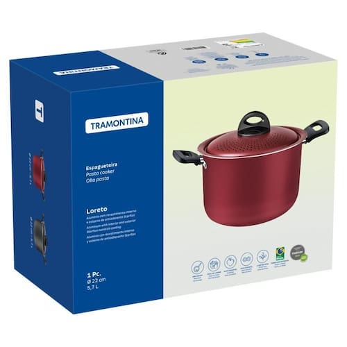 Para fazer uma massa deliciosa para o almoço da sua família e de receita tradicional, a espagueteira Tramontina Loreto em alumínio com revestimento interno e externo em antiaderente Starflon Max grafite 22 centímetros de diâmetro 5,7 litros é indispensável. Desenvolvida com corpo de espessura de 1,6 milímetros em alumínio e revestimento interno e externo de antiaderente Starflon Max, ela cozinha diferentes tipos de masssa de maneira rápida e uniforme, sem que elas grudem em sua superfície. Sua tampa em alumínio possui furos escorredores e trava, o que garante maior praticidade na hora de tirar a água do alimentos. Suas alças são em baquelite antitérmico e seu pegador em nylon, ambos materiais que oferecem maior durante o manuseio, pois não aquecem. Além de todas essas características, a espagueteira pode ir à máquina de lavar louças, facilitando seu dia a dia na cozinha!