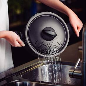 Para fazer uma massa deliciosa para o almoço da sua família e de receita tradicional, a espagueteira Tramontina Loreto em alumínio com revestimento interno e externo em antiaderente Starflon Max grafite 22 centímetros de diâmetro 5,7 litros é indispensável. A espagueteira Tramontina foi desenvolvida com corpo de espessura de 1,6 milímetros em alumínio e revestimento interno e externo de antiaderente Starflon Max, ela cozinha diferentes tipos de massa de maneira rápida e uniforme, sem que elas grudem em sua superfície. Sua tampa em alumínio possui furos escorredores e trava, o que garante maior praticidade na hora de tirar a água do alimentos. Suas alças são em baquelite antitérmico e seu pegador em nylon, ambos materiais que oferecem maior segurança durante o manuseio, pois não aquecem. Além de todas essas características, a panela de macarrão pode ir à máquina de lavar louças, facilitando seu dia a dia na cozinha.