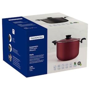 Espagueteira Tramontina Paris Antiaderente Starflon Max com Tampa de Alumínio Vermelho 24 cm 7,3 L Tramontina - Espagueteira Tramontina Paris em Alumínio com Revestimento Interno e Externo em Antiaderente Starflon Max com Tampa de Alumínio Vermelho 24 cm 7,3 L Preparar o macarrão para seu almoço ficou muito mais prático com a espagueteira Tramontina Paris em alumínio com revestimento interno e externo em antiaderente Starflon Max com tampa de alumínio vermelho 24 centímetros 7,3 litros. É produzido em alumínio com espessura de 1,8 milímetros e revestimento interno e externo de antiaderente Starflon Max. Devido a essas características, ela cozinha o alimento de maneira rápida e uniforme, e fácil de limpar, mais durável e não prejudicial a saúde. Sua tampa é em alumínio e possui furos escorredores que facilitam a hora de escorrer a água e pegador em nylon e alças em baquelite antitérmico, que não aquecem e deixam o manuseio mais seguro e confortável. A espagueteira ainda é muito prática e pode ir à máquina de lavar louças Corpo de alumínio com espessura de 1,8 mm que proporciona cozimento rápido e uniforme. Revestimento interno e externo de antiaderente Starflon Max que não gruda, é fácil de limpar, mais durável e não é prejudicial à saúde, pois é livre de PFOA. Tampa para espagueteira de alumínio com furos escorredores e trava. Alças de baquelite antitérmico e pegador de nylon que oferecem segurança durante o manuseio. Pode ir à máquina de lavar louças facilitando seu dia a dia. Cuidados com o produto A capacidade volumétrica máxima para cozimento é de 3/4 da capacidade total da peça. Em fogões com grade, centralize a peça e alinhe as alças com a grade. Centralize seu utensílio com a chama ou fonte de calor. Utensílios quentes devem estar fora do alcance das crianças. Antes do primeiro uso, lave com esponja macia, sabão neutro ou detergente líquido. Depois de secar, unte a área interna com óleo ou gordura e leve ao fogo por um ou dois minutos. Deixe esfriar e lave novamente. Seu utensílio Starflon está pronto para uso com ou sem gordura, sempre em fogo baixo ou médio nunca superior a 260 C . Para mexer os alimentos use somente utensílios de silicone, nylon ou madeira. Com o uso, as alças e o pegador podem afrouxar devido à dilatação normal dos materiais. Reaperte apenas o suficiente, sem forçar. Limpeza: Evite a imersão do utensílio quente em água fria. Nunca utilize produtos abrasivos na lavagem. Se deixar queimar alimentos, umedeça a área e até que possa remover os resíduos grudados com esponja e sabão. Para descarte do produto e embalagem siga as orientações de reciclagem vigentes. 90 dias para vícios ou defeitos de fabricação. Características Gerais do Produto: : 3 meses Contra defeitos de fabricação Marca: Não Informado