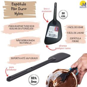A camada generosa de nylon investida na peça transmite firmeza para o usuário e seu desenho mais fino na ponta garante eficiência máxima para mexer os alimentos grudados nos cantinhos mais difíceis do fundo da panela.