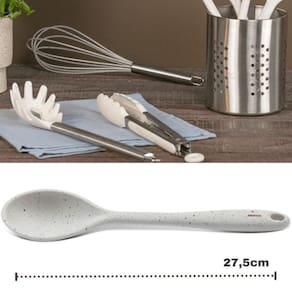 Lance a primeira pedra aquele que nunca riscou uma panela Por isso, somos fãs dos utensílios de silicone na hora de preparar os alimentos, pois deslizam suavemente pela panela, evitando arranhões. Além disso, você pode bater a haste para remover o excesso sem danificar a borda. O silicone facilita muito a limpeza, graças à sua superfície lisa que não retém odores, evita a proliferação de bactérias e não conduz o calor gerado pelo fogão. Marca: Não Informado