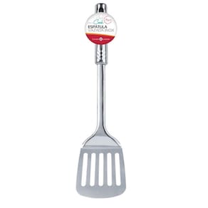 Espátula Aço Inox Vazada Chapeiro Fritura Utensílio Cozinha Tamanho Grande 33CMA espátula de aço inox com cabo longo é um utensílio perfeito para te auxiliar na hora de cozinhar com mais praticidade, tornando sua experiência na cozinha simples e agradável.Especificações Técnicas:Dimensões da Peça: 33 cm de comprimento x 7,5 cm de larguraMaterial: Produzida em Aço inoxidável,Resistente (aço inox)DurávelModelo: vazadaPossui cabo com furo passante para pendurar o utensílioPode ir à máquina de lavar louças.ITENS INCLUSOS01 - Espátula Aço Inox Vazada