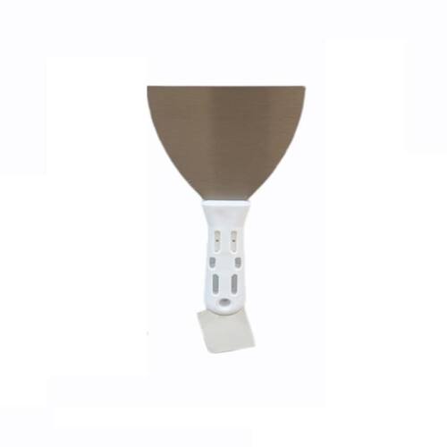 A espátula é feita em aço inox e o seu cabo em plástico, é leve e fácil de ser usada, adere super bem nas mãos facilitando na hora de seu uso, não transmite gosto ou cheiro nos alimentos. No churrasco, a espátula é um utensílio que ajuda na movimentação de grelhados e hamburgueres em sua grelha ou até mesmo auxilia na limpeza de chapeiras e grelhas.