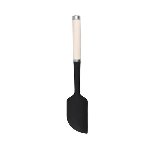 A espátula da KitchenAid possui a ponta principal feita de silicone flexível, com uma borda reta e a outra curva, e possui um cabo de plástico ergonômico.